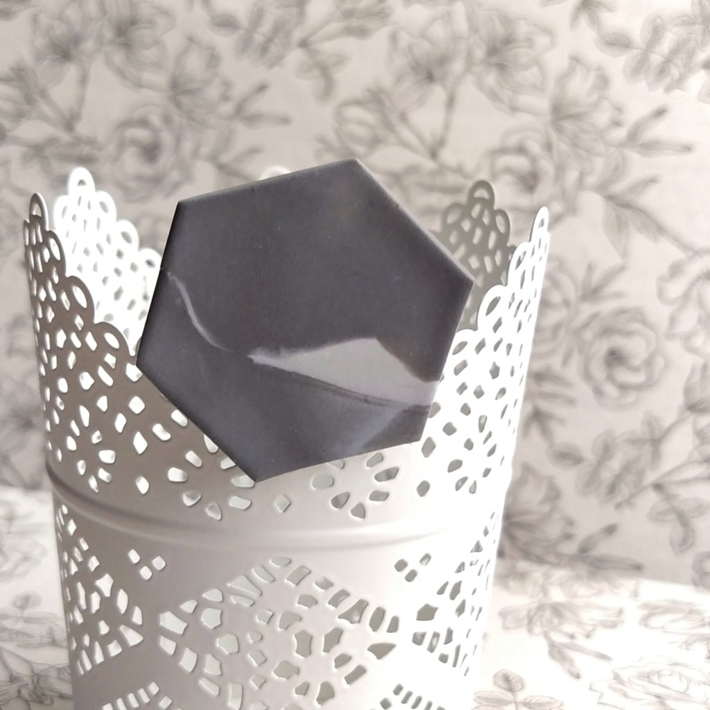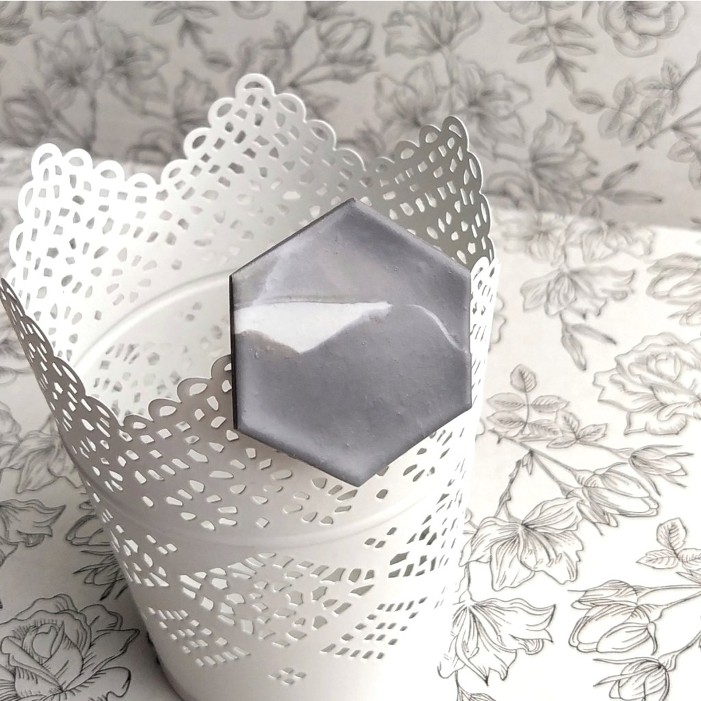 - Šestiúhelník - z šedé a bílé polymerové hmoty, průměr 4,5 cm.