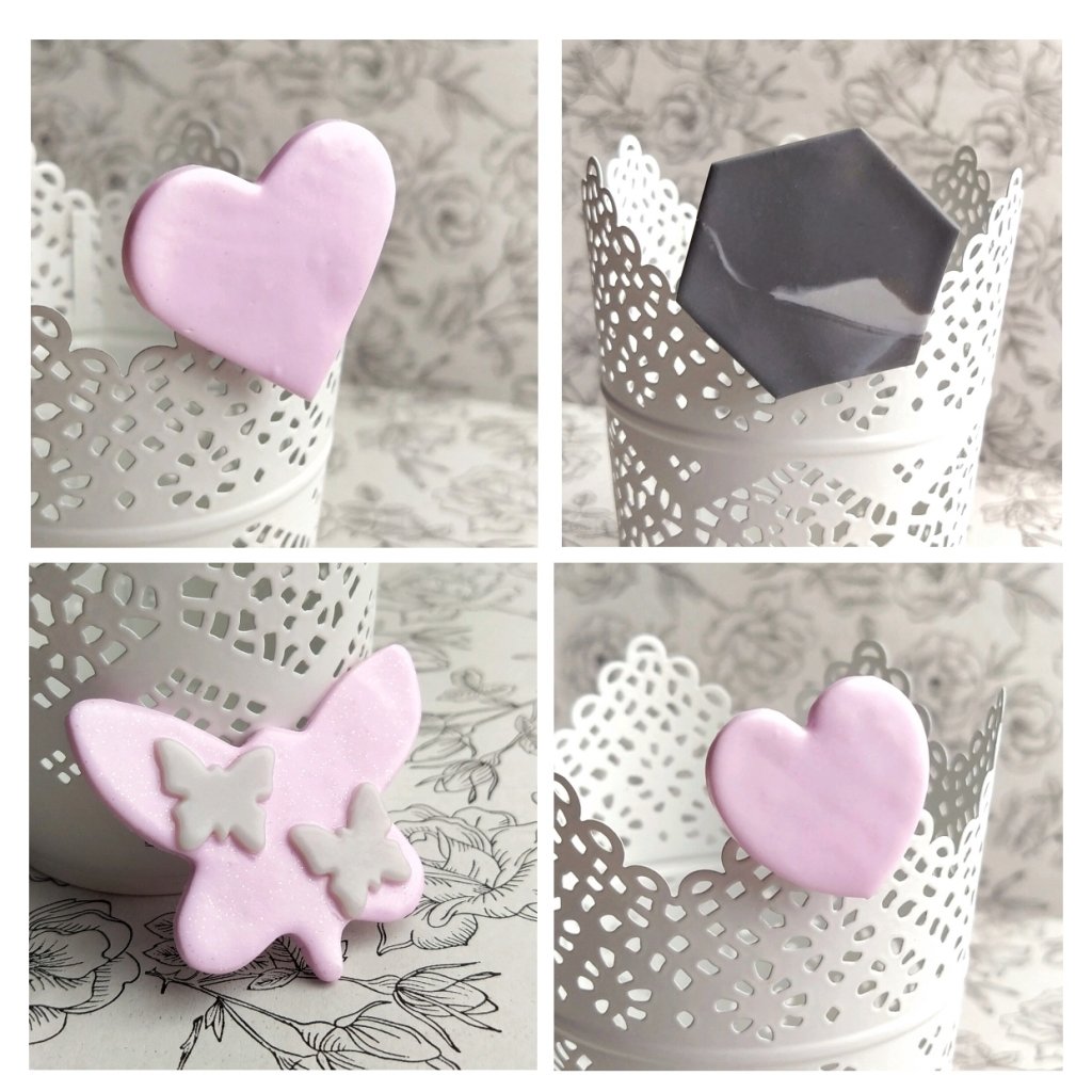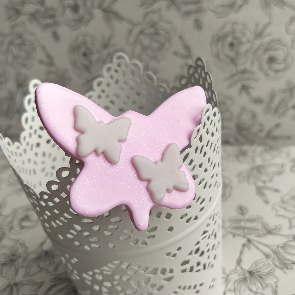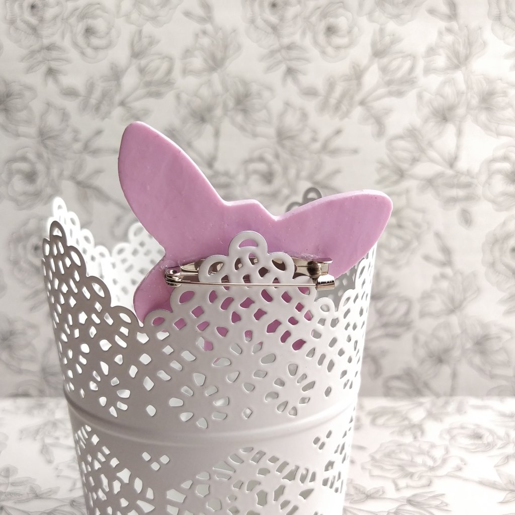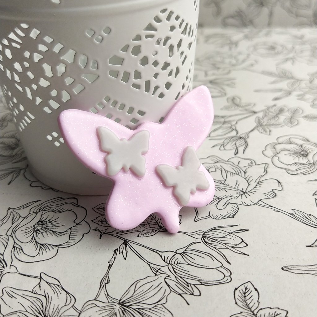 - Motýl - z růžové třpytivé a bílé polymerové hmoty, výška 5,5 cm, šířka 6 cm