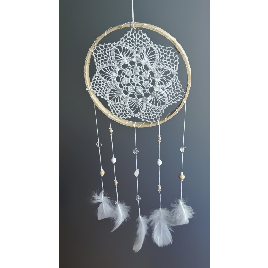 Materiál: dřevěný kruh, vnitřek je háčkovaný z příze, skleněné a plastové korálky, bílé peří.
