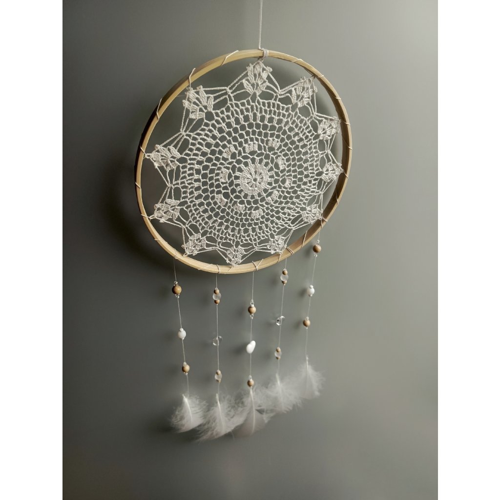 Materiál: dřevěný kruh, vnitřek je háčkovaný z příze, skleněné a plastové korálky, bílé peří.