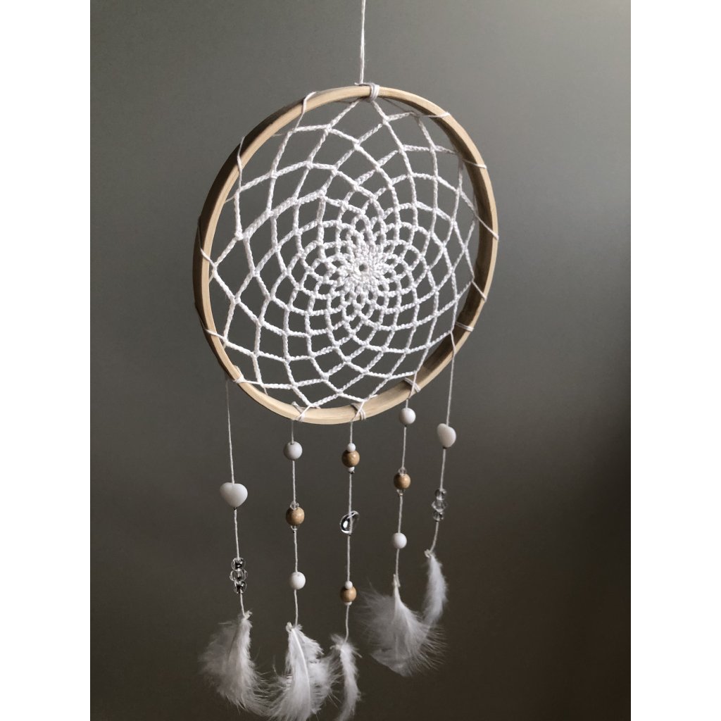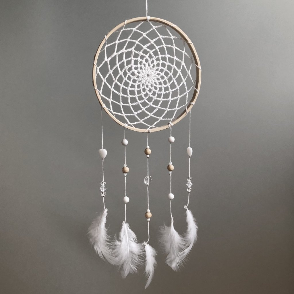 Ručně háčkovaný lapač snů. Průměr kruhu 12,5 cm, délka bez poutka 35 cm.