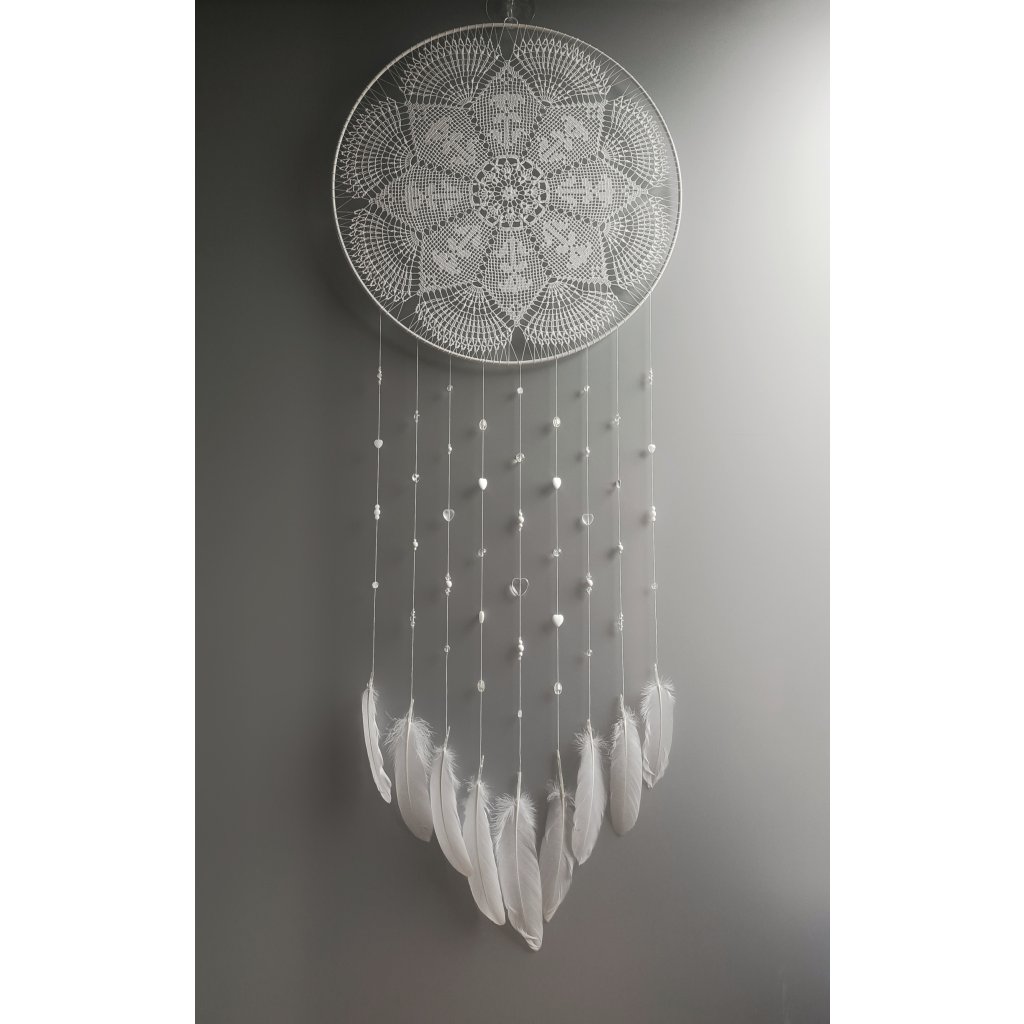 Materiál: kovový kruh, vnitřek je háčkovaný z příze, skleněné a plastové korálky, peří.