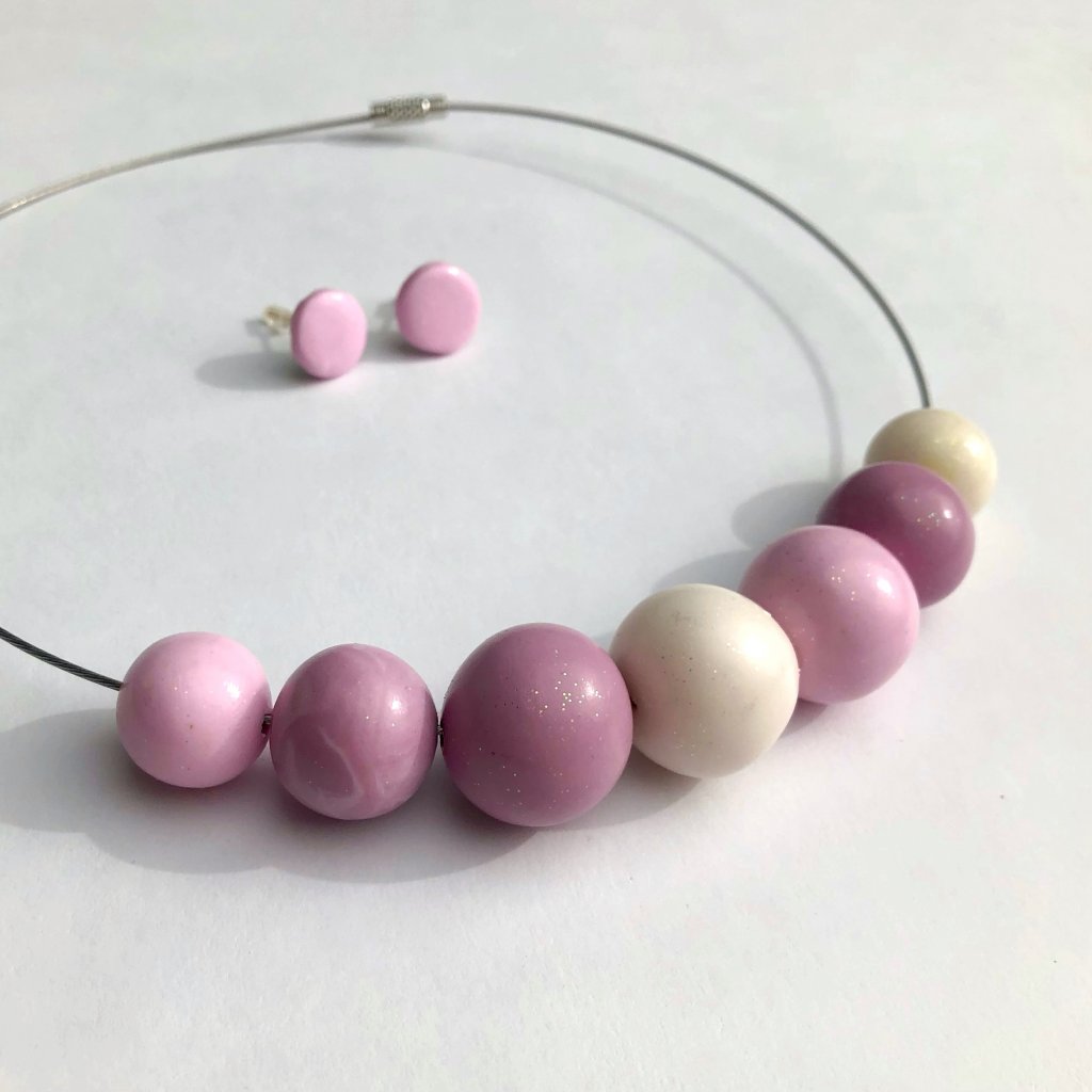 Set obsahuje náhrdelník a peckové náušnice z ručně vyrobených korálků z třpytivé polymerové hmoty.