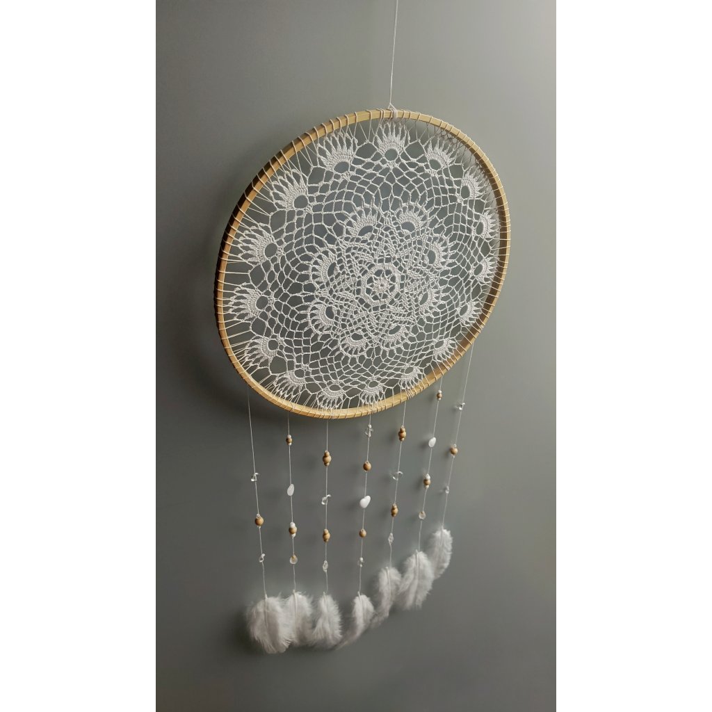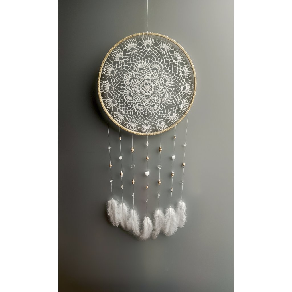 Materiál: dřevěný kruh, vnitřek je háčkovaný z příze, skleněné a plastové korálky, peří.