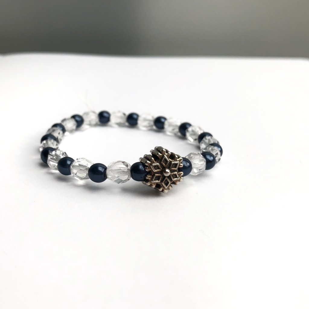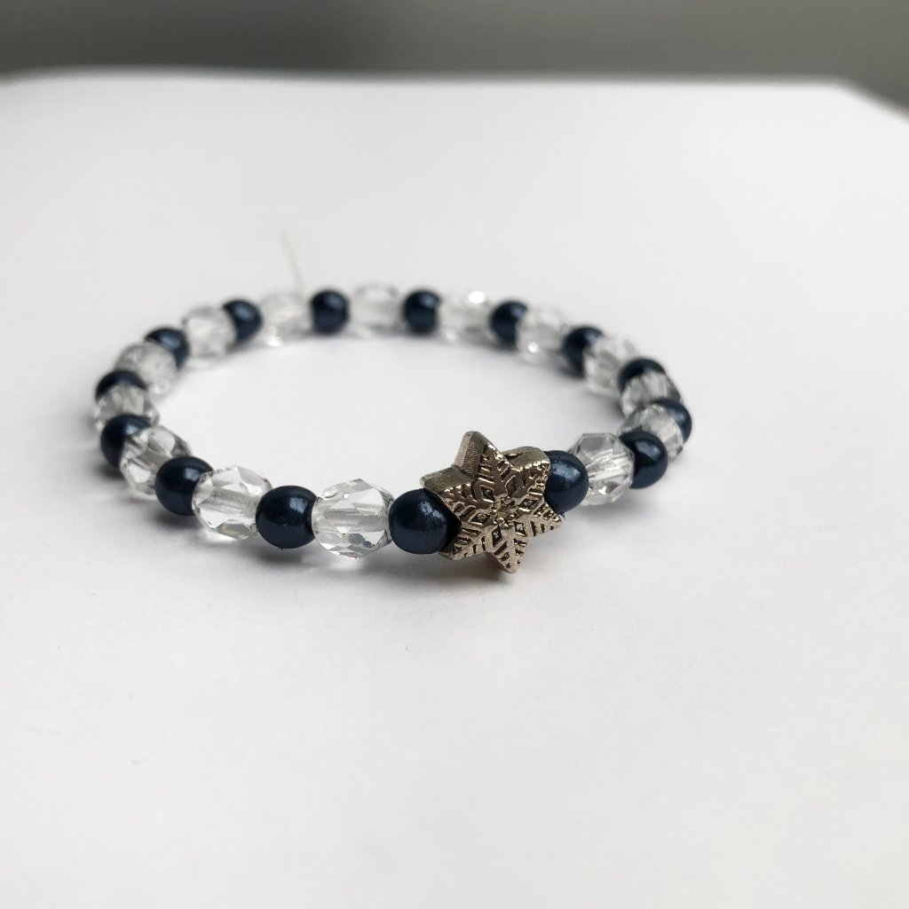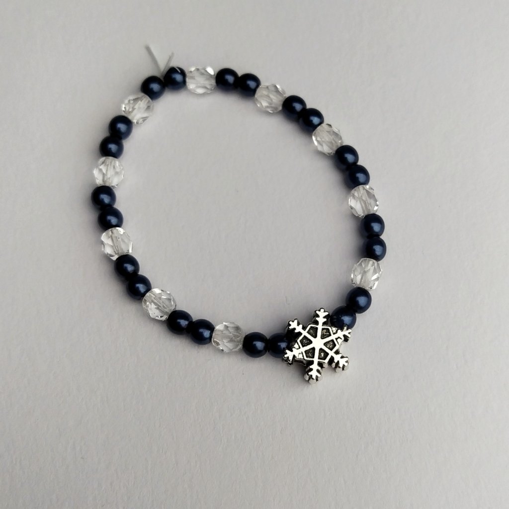 Náramek je vyrobený z voskovaných perel a skleněných broušených korálků, který je doplněn ozdobou z bižuterního kovu ve tvaru vločky