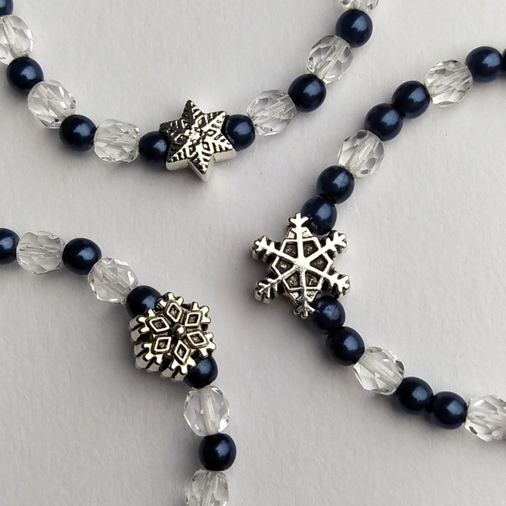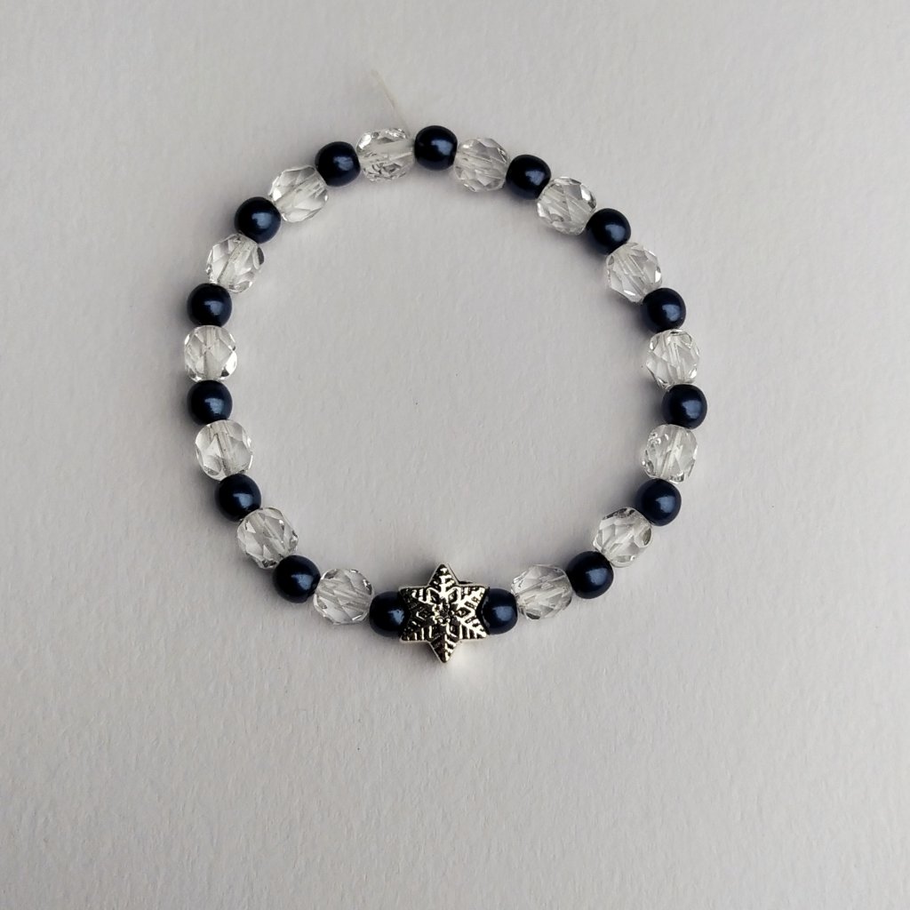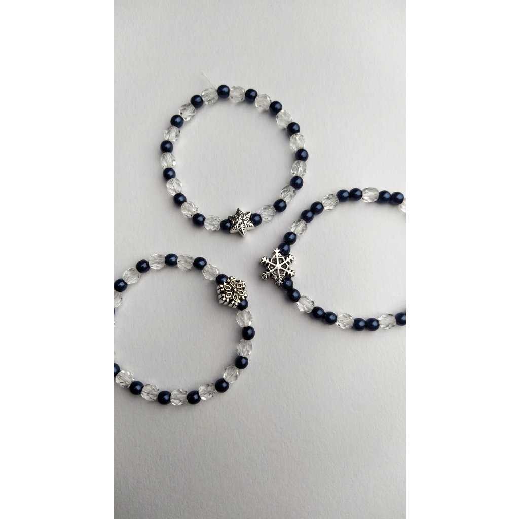Náramek je vyrobený z voskovaných perel a skleněných broušených korálků, který je doplněn ozdobou z bižuterního kovu ve tvaru vločky